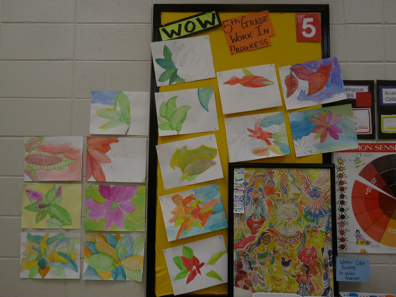 When 5th grade students began their water color paintings of previously recorded observational drawings of live poinsettias, I utilized a board full of outstanding work in progress for all 5 classes to view.